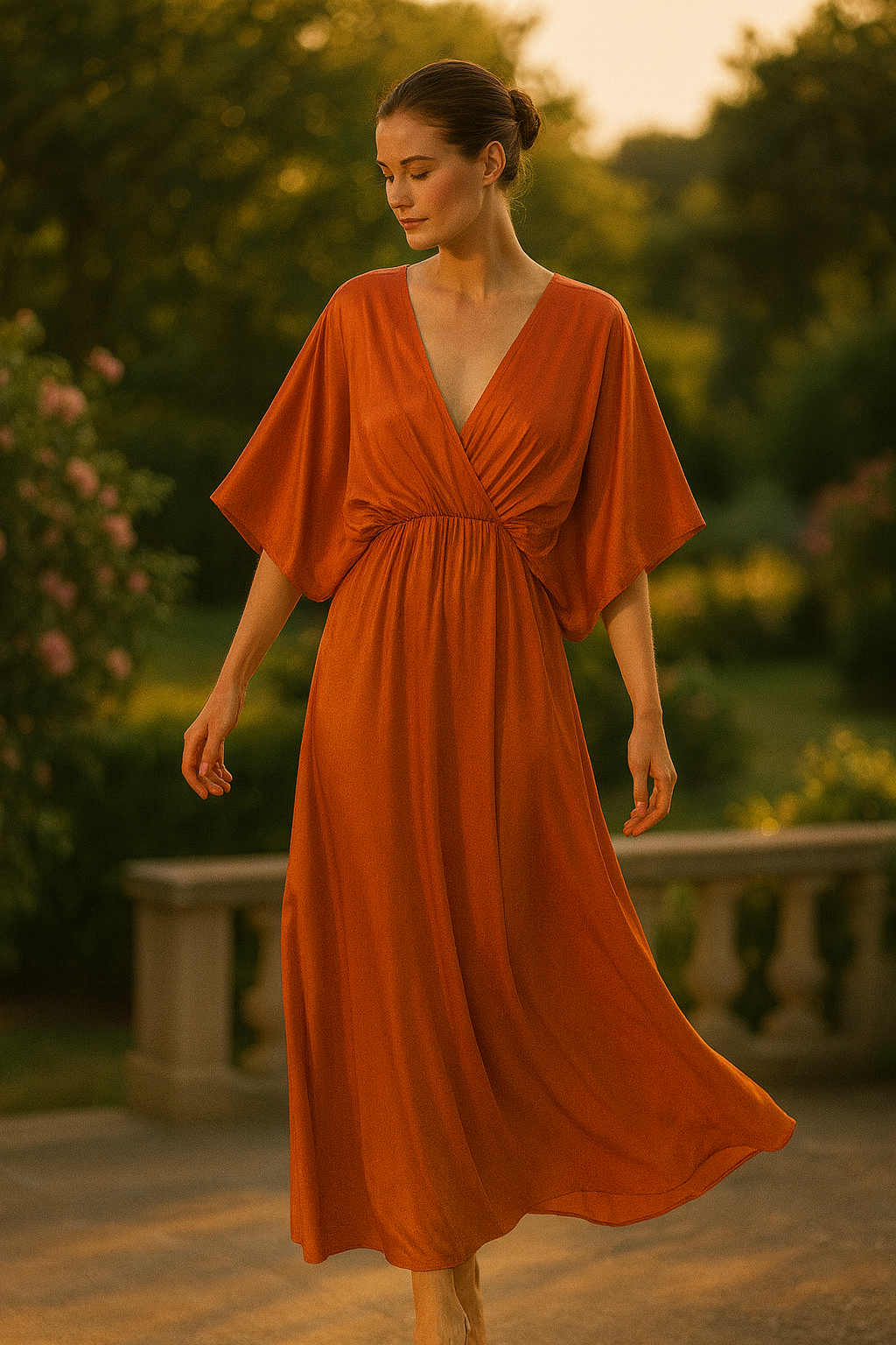 Draperad långklänning med fladdermusärmar med flytande drapering och elegant fall. Dess smickrande omlottringning, rynkade midja och fladdermusärmar skapar en luftig volym och en feminin silhuett utan ansträngning. Tillverkad i mjuk och lätt satinviskos, erbjuder den en känsla av lätthet vid varje rörelse