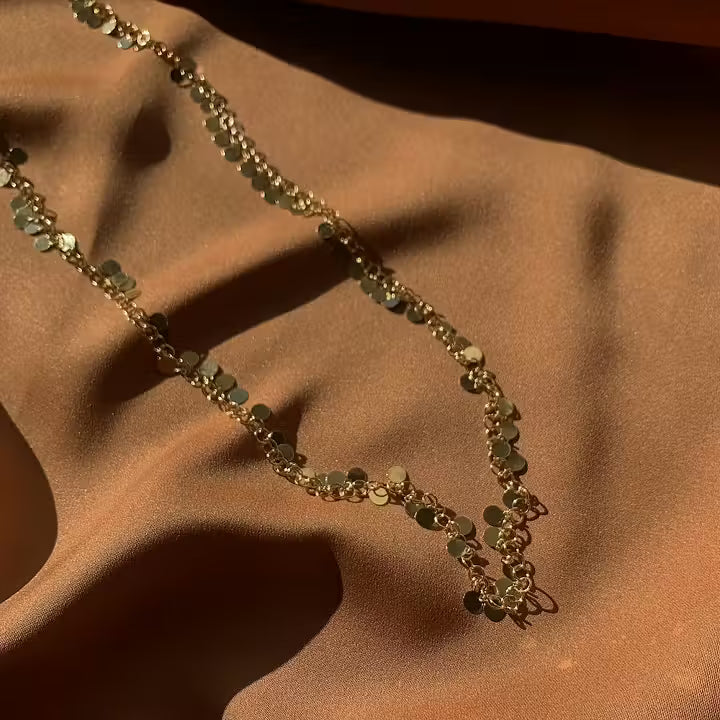 De guld-pläterade silverplattorna är ca 5 mm i diameter och gör att hela halsbandet skimrar och blänker väldigt fint Halsbandet är reglerbart upp till 60 cm som längst och väger 12,27 gram.